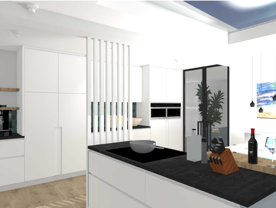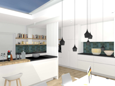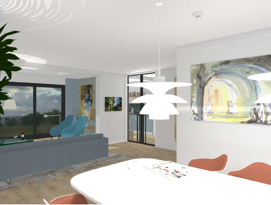 Mijn reactie was natuurlijk enthousiast. Die van hun opgelucht. Ze waren door de plattegronden en impressies aangenaam verrast dat dit allemaal kon in hun nieuwe huis. Maar hadden hun twijfels of de doorgangen, zichtlijnen en ruimtelijkeheid goed uitkwamen, dus daarom alles ‘even’ uitgezet.